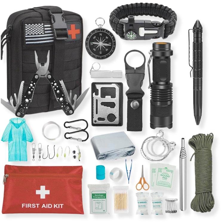 Lampa, first aid kit, sax, kompass, kniv och nödhammare samt mycket mer ingår.