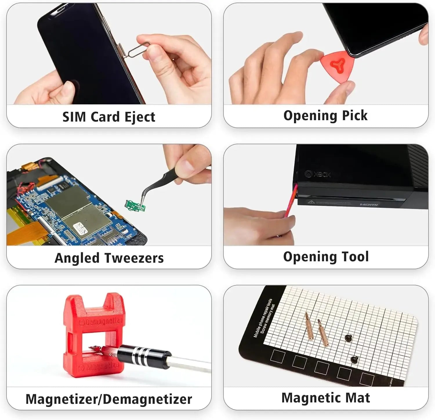 🧰 Magnetiskt och Antistatiskt: Magnetiseraren kan magnetisera alla skruvhuvuden för att hjälpa dig att exakt rikta in skruvhålen. Varje bit är belagd med antistatisk ESD-beläggning som förhindrar statiska skador på elektroniska komponenter. ESD-metallpincetten är tillverkad av högkvalitativt och slitstarkt rostfritt stål, motståndskraftigt mot de flesta syror och korrosiva ämnen. Bitshållare med halkfritt handtag ger ökad komfort.